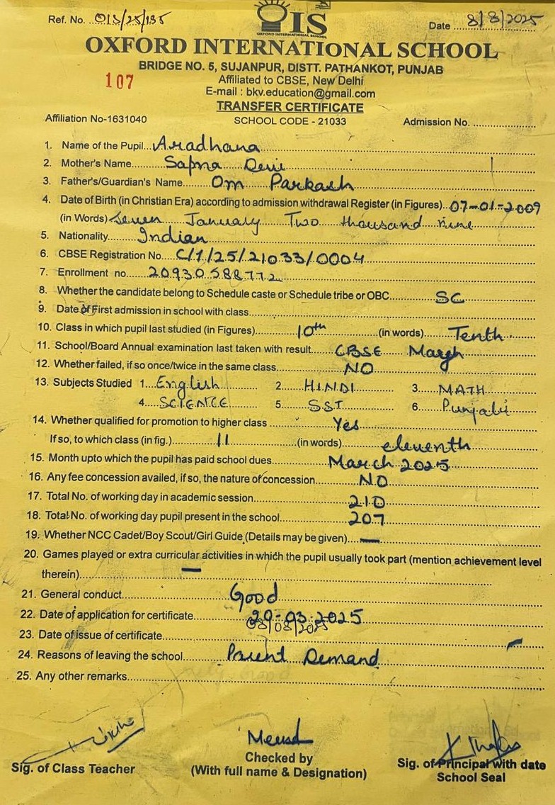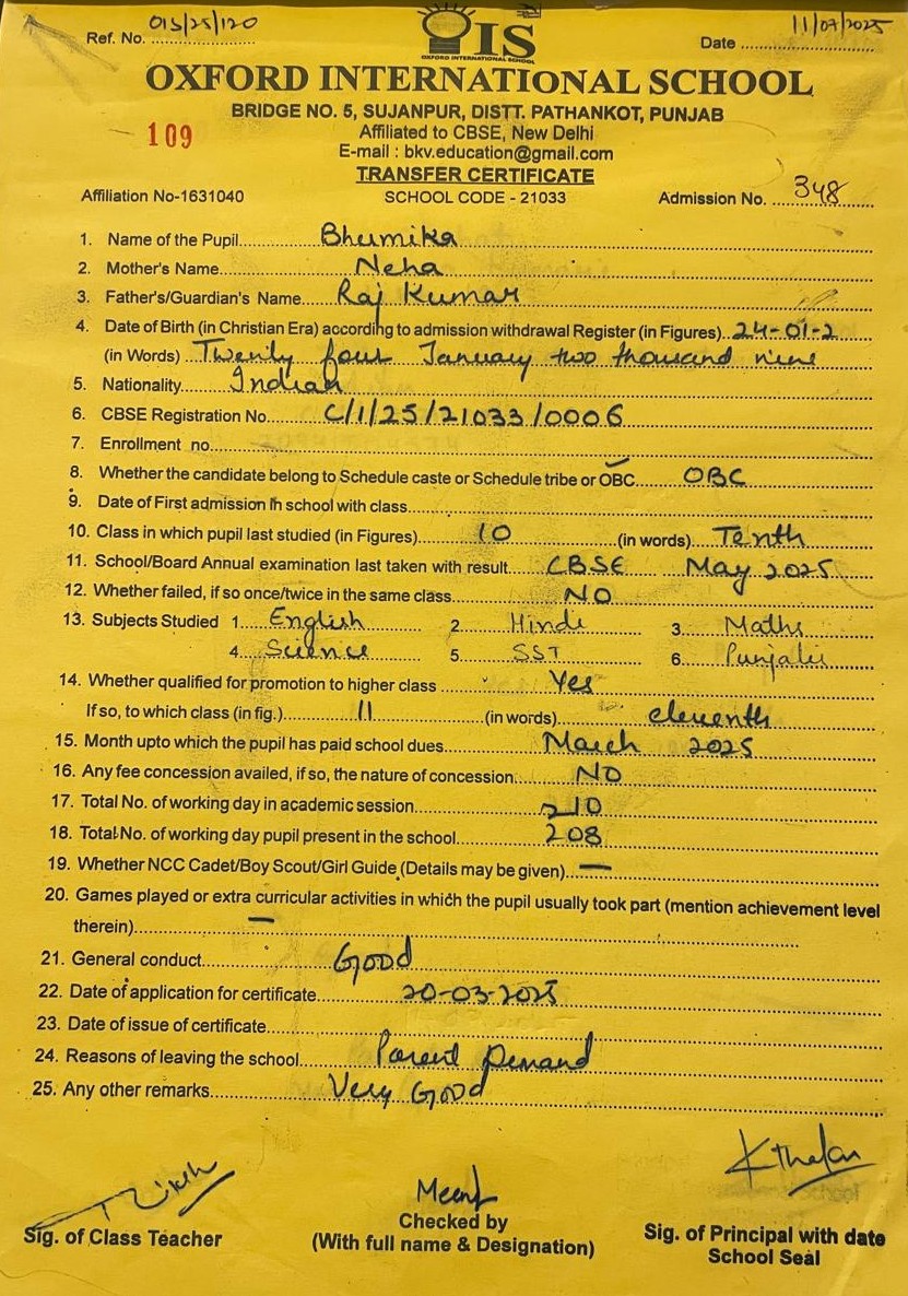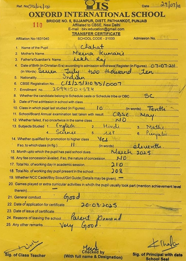 Transfer Certificate